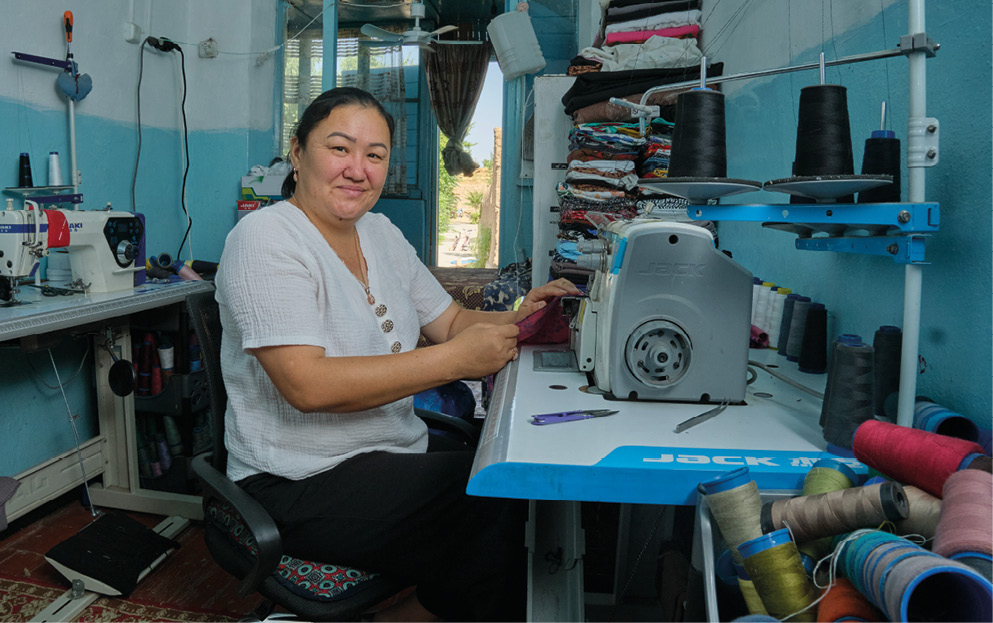 Рахат, как и многие её односельчане, в поисках заработка была вынуждена уехать в Россию. Сначала она ездила вместе с мужем, но после рождения детей осталась дома, в то время как муж продолжал работать за границей. Со временем их семья распалась, и вся ответственность за воспитание детей легла на её плечи. Для того, чтобы начать свой бизнес, Рахат решила освоить профессию швеи, так как с детства интересовалась рукоделием и дизайном. Начала с одной швейной машинки, которую купила на свои сбережения. Узнав о проекте, увидела в нем возможность расширить свои знания и навыки. Благодаря тренингам по финансовой грамотности, бизнес- планированию и поддержке ментора, она разработала бизнес-план создания своего цеха по пошиву одежды.