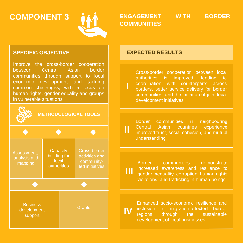 The Component aims to improve the cross-border cooperation between Central Asian border communities through support to local economic development and tackling common challenges, with a focus on human rights, gender equality and groups in vulnerable situations. The activities will focus on capacity development of local authorities and civil society, design and implementation of border communities initiatives, provision of grants to NGOs and support of micro/small business development in border regions.